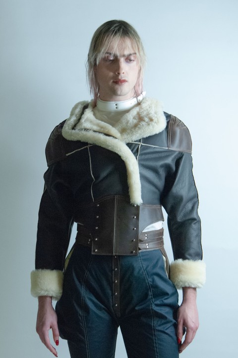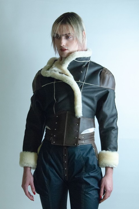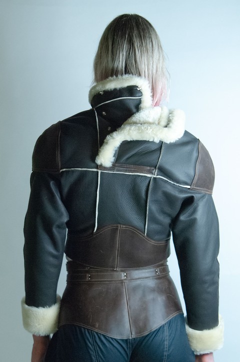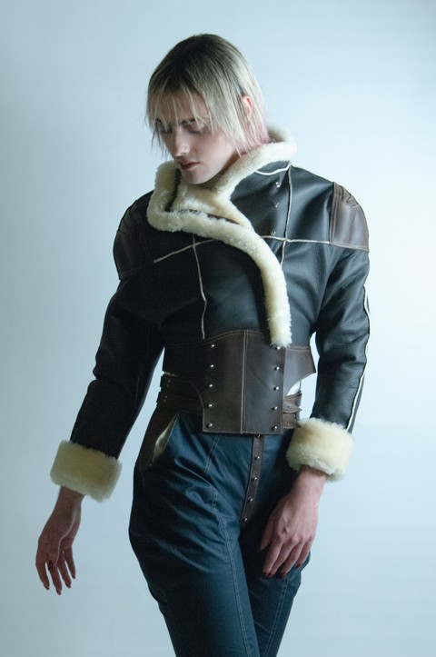 Super cropped batwing sleeve straight wool shearling jacket with overlapping panels along the front and upper back. Sam Browne closures running along the rim of said panels. Soft aviator shearling with a smooth leather reverse. Full grain pull up cow hide reinforced shoulders and waistbelt: this material marks with handle and wear. Raw, trimmed outward jutting seams. Folded back and secured edges.