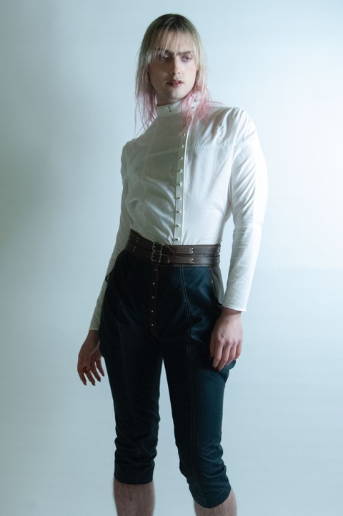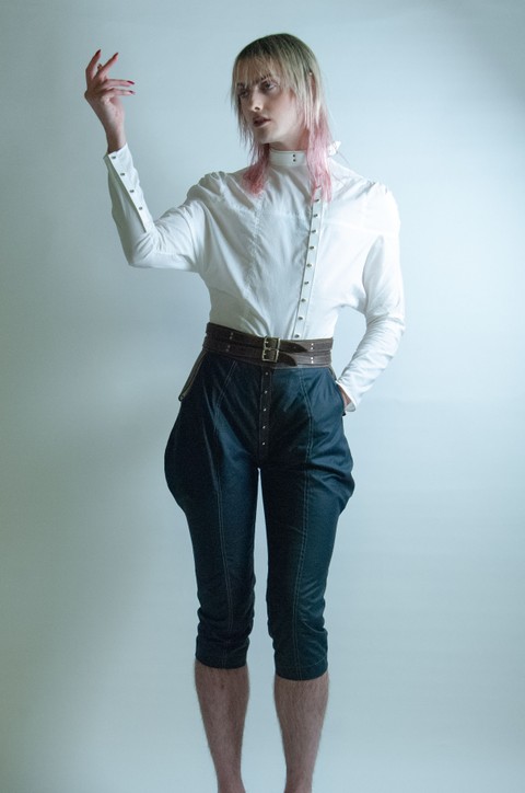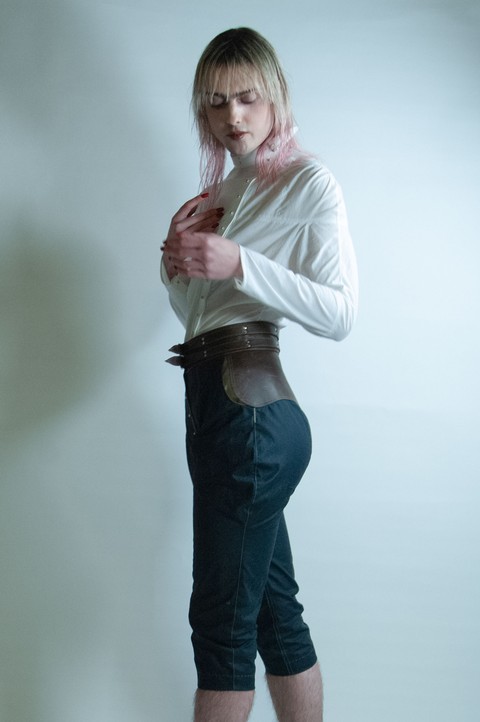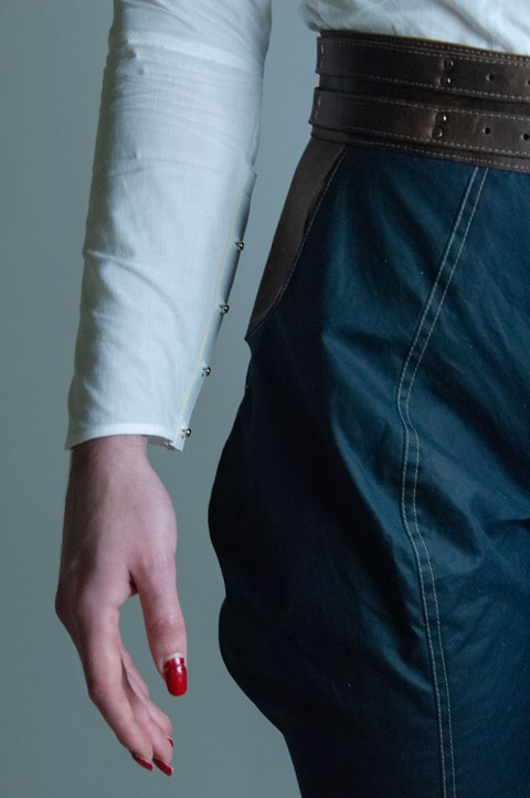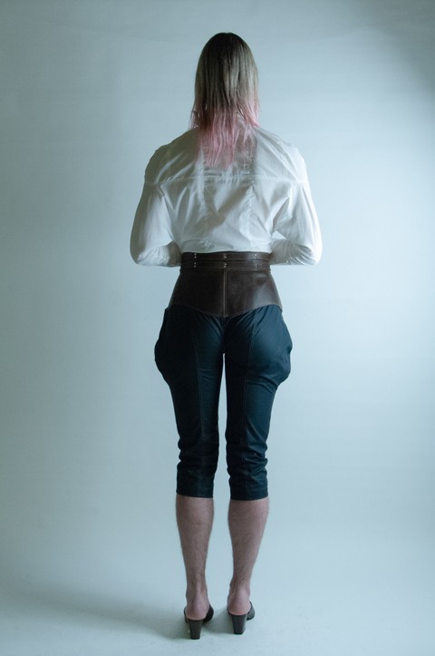 Fully silk lined three:quarter length elephant ear trousers with a centre:front Sam Browne closure. In 6oz Millerain Evolution waxed cotton; a machine washable wet wax. Like traditional waxed cotton, the fabric marks with handle and wear. Full grain pull up cow hide: this material marks with handle and wear. Double rivet mounted equestrian buckle belts. Flat and felled inner thigh and CF / CB seam. For long lasting and non fraying seams. Decorative rough hand:stitched hem.