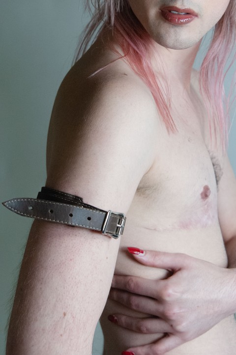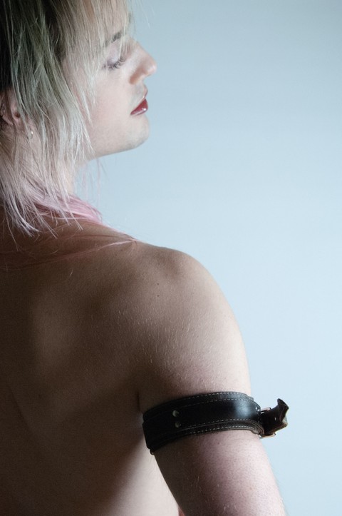 Full grain pull up cow hide choker: this material marks with handle and wear. Rivet mounted equestrian buckle belt(s). Edge stitched all around.