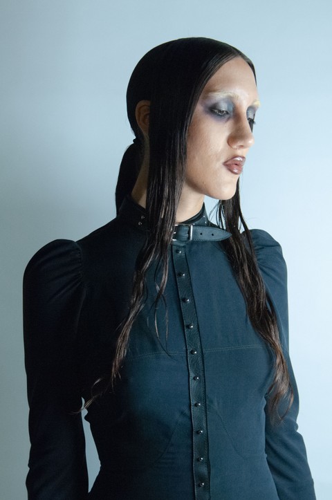 Fitted silk maxi dress with a centre:front Sam Browne closure and wrist slits. In a spun sandwashed silk, giving the fabric a textured and ashy appearance. Full grain pull up cow hide: this material marks with handle and wear. Rivet mounted equestrian buckle belt. French seamed or zigzag cut and topstitched seam allowances for long lasting and non fraying seams. Pin:hemmed or bound edges.